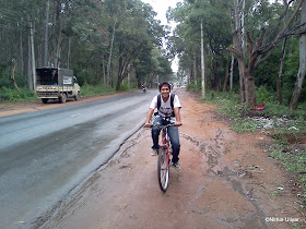 Plan was to start early on a lazy Sunday morning of 31st July, thanks to the overcast weather of Bangalore with a few drizzle spells here and there. A perfect condition for long distance cycling, and this condition was maintained for the entire duration of the ride. So much so that it was not at all required to use any sort of sunscreens which in any other condition would have resulted in a severely sun burnt "Mr. Nithin" :P. Ravi was to arrive from Malleswaram and he left home quite early and Shashi came near my house and the first thing that came to my lips were WTF ??!!!! (the first profanity I uttered for the day :P). He was wearing a full length jeans pant and a huge backpack filled with eatables and other stuff. I on the other hand had my tights on and couple of bananas in my so called backpack. A complete contrast of sorts. A sort of before and after mug shots of a weight loosing ad. :P