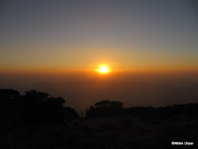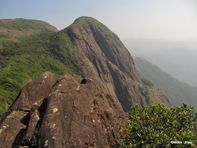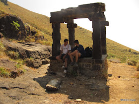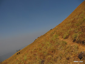 Left the place at around 10.30 , moved towards the forest check-post , joined along with a IISc group of 3 in order to bring down the costs (they issued entry receipt for 5 people for a grp of 8 with 200/head). From here starts the most challenging part of the trek, in fact the only challenging part. Open grasslands , with no shade and steep gradients, one has to conquer 2 peaks before attempting the final peak of KP. Here the progress was slow. In these grasslands the only watering point available is @Kallu Mantapa which is almost 2.5-3kms from Bhatta's house. Reached the place, rested in the shade of the mantap, refilled our bottles and it was time to move on. Many first timers easily get decepted into believing that the first peak is the final destination of KP. With the other 2 peaks invisible they see that peak as the highest in the vicinity. Once we climb up our first "false" peak one gets to view the awesome drops from the sides of Sheshaparvatha. Close of 1000 ft vertical drops !!!!!! . Also from the 2nd peak there is stone projecting into the oblivion, where I had got a snap taken. Even after 2.5 yrs I still hadn't got the guts to sit on the edge of the rock , but Shashi was so interested to have a snap taken sitting on the edge. This was not surprising since his mobile wallpaper is of a person sitting on the edge of Preikestolen in Norway and he looked desperate to replace that with his own snap :P.